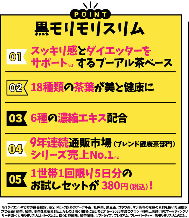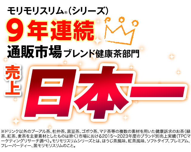 ※モリモリスリムシリーズ累計販売包数(ほうじ茶、紅茶、コーヒー、ソフト、プレミアム、黒モリ、フレーバーティー)2024年10月末時点出荷実績 自社調べ。